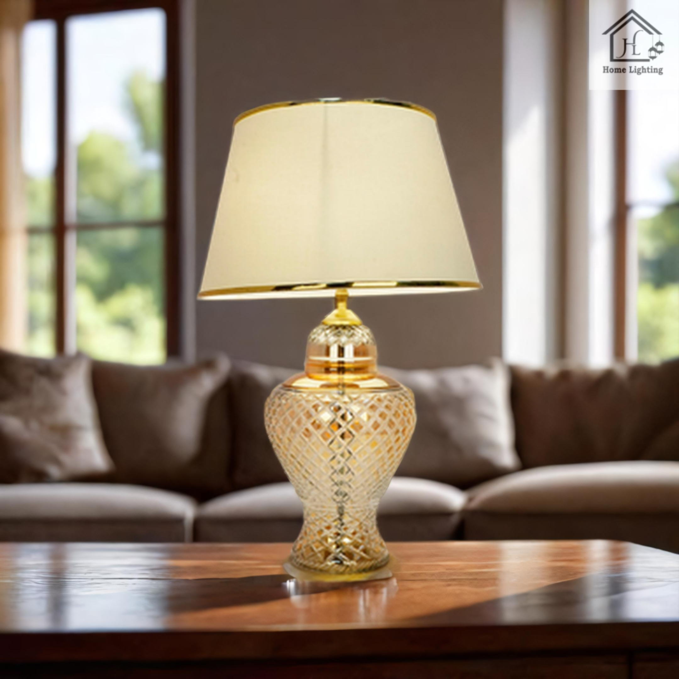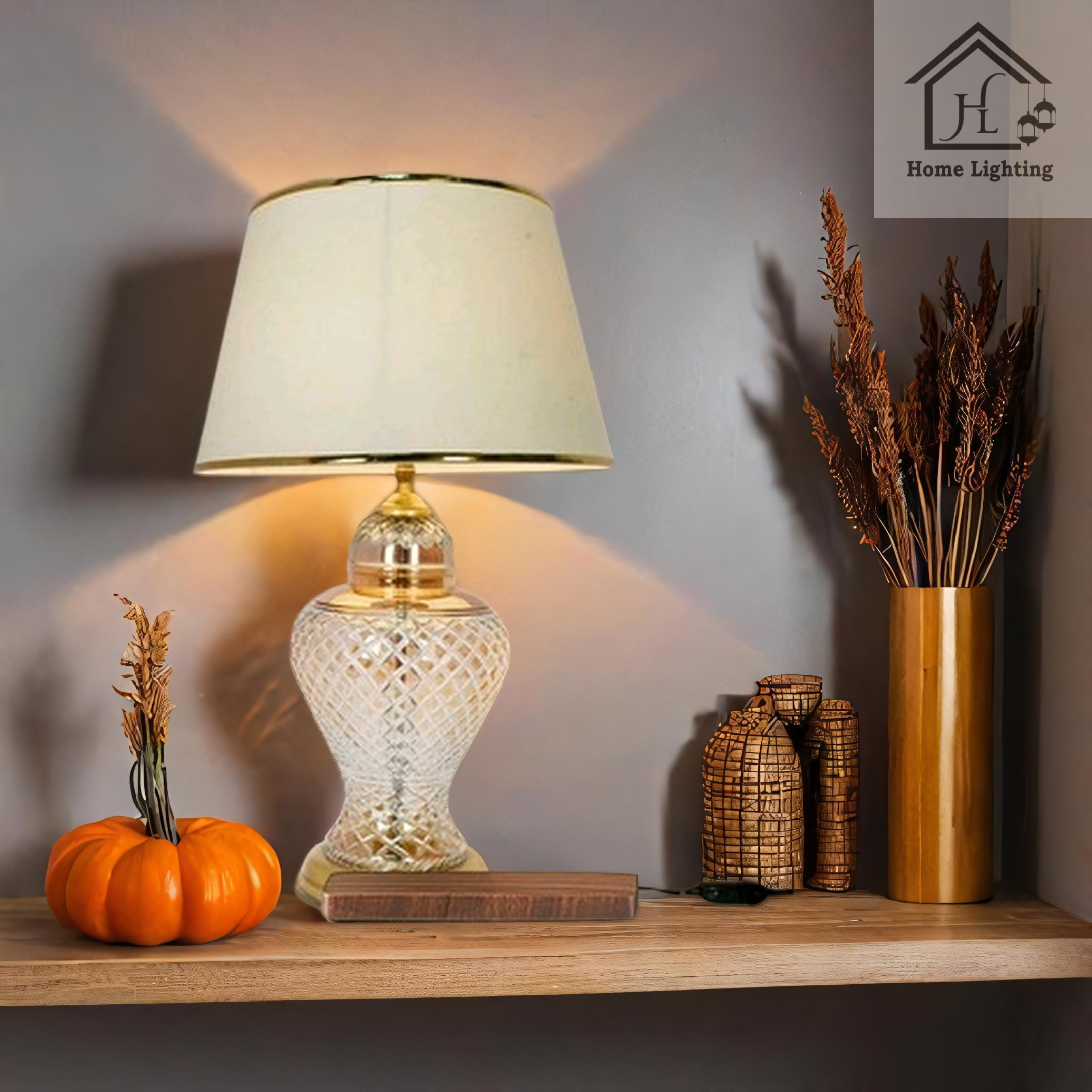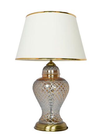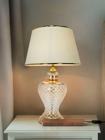 Add a touch of timeless elegance to your living space with this exquisite crystal-cut table lamp. The intricately designed glass base features a stunning diamond pattern that catches and reflects light beautifully, creating a mesmerising ambience in any room. Topped with a classic cream-coloured fabric shade with metallic trim, this lamp seamlessly blends traditional craftsmanship with contemporary style. The substantial base provides excellent stability, while the brass-finished hardware adds a luxurious accent. Perfect for bedside tables, living room end tables, or office desks, this lamp stands and provides warm, ambient lighting ideal for reading or creating a cosy atmosphere. The shade’s wide diameter ensures optimal light distribution, while the high-quality materials promise enduring style. Whether illuminated or not, this lamp serves as a sophisticated decorative piece that elevates your home’s décor.