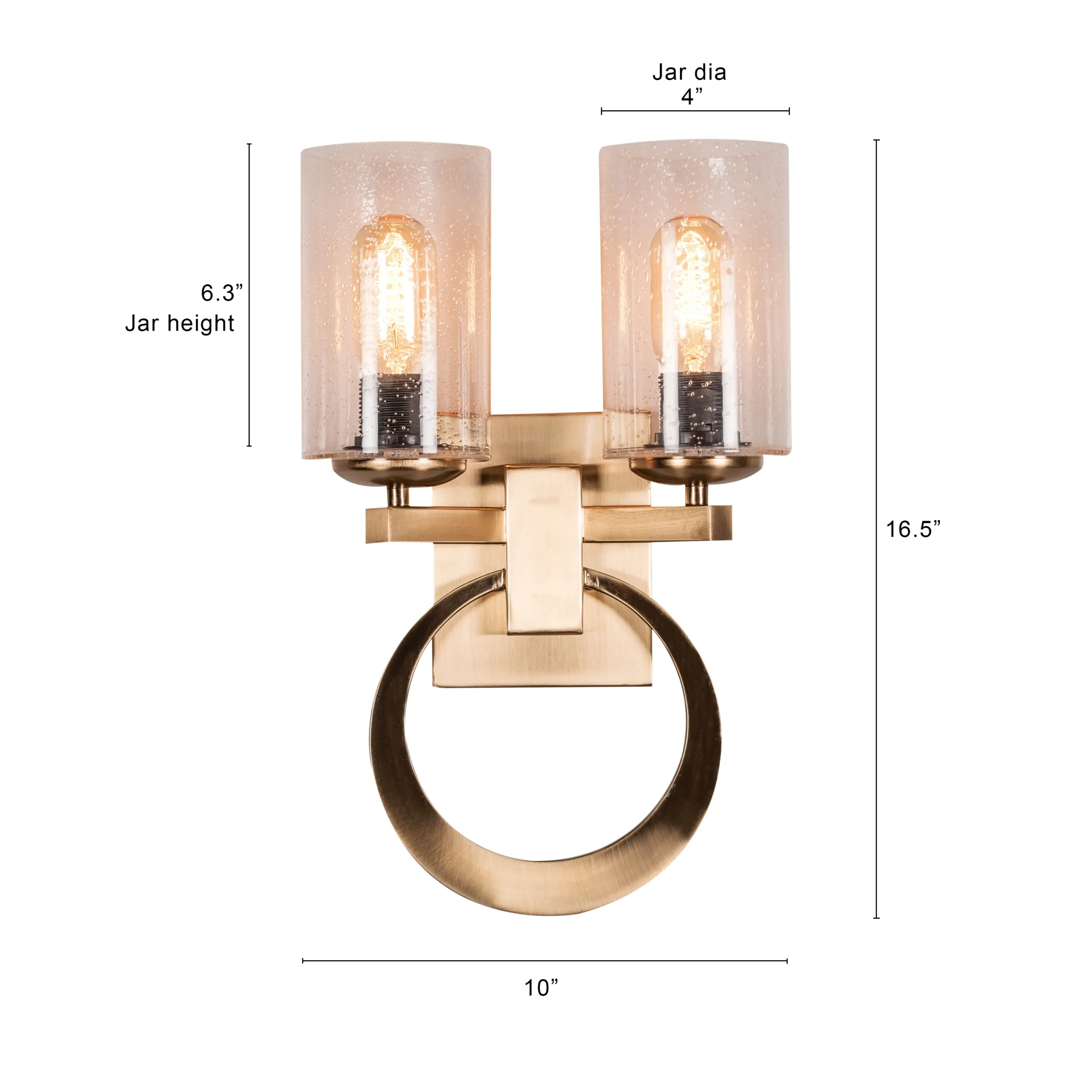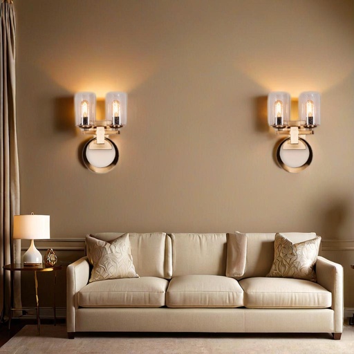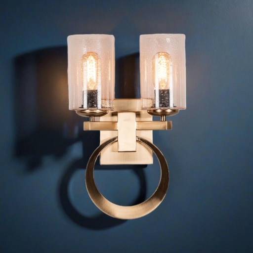 Elevate your interior décor with this stunning modern wall sconce that masterfully combines contemporary design with practical illumination. The fixture features two elegant glass shades that diffuse light beautifully, creating a warm and inviting ambiance in any room. The brushed gold finish adds a touch of sophistication, while the distinctive ring design serves as both a striking visual element and a sturdy mounting bracket. This dual-light configuration provides ample illumination for hallways, dining areas, or as bedside lighting. The clear glass cylinders encasing each bulb create a perfect balance of form and function, allowing maximum light output while maintaining a sleek aesthetic. The robust construction ensures lasting durability, while the timeless design complements both modern and traditional décor styles. Perfect for residential spaces or upscale commercial environments, this wall sconce adds both character and functionality to your lighting scheme.