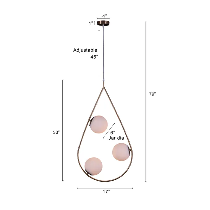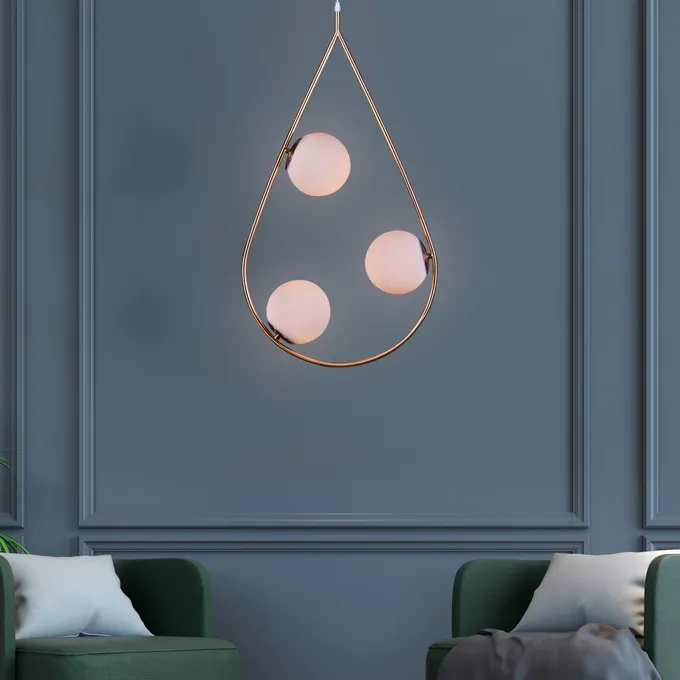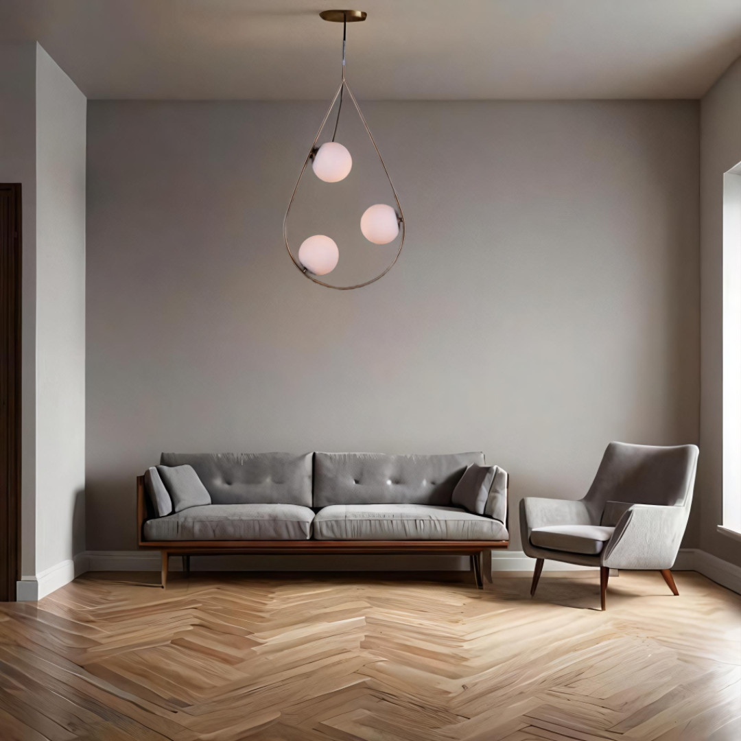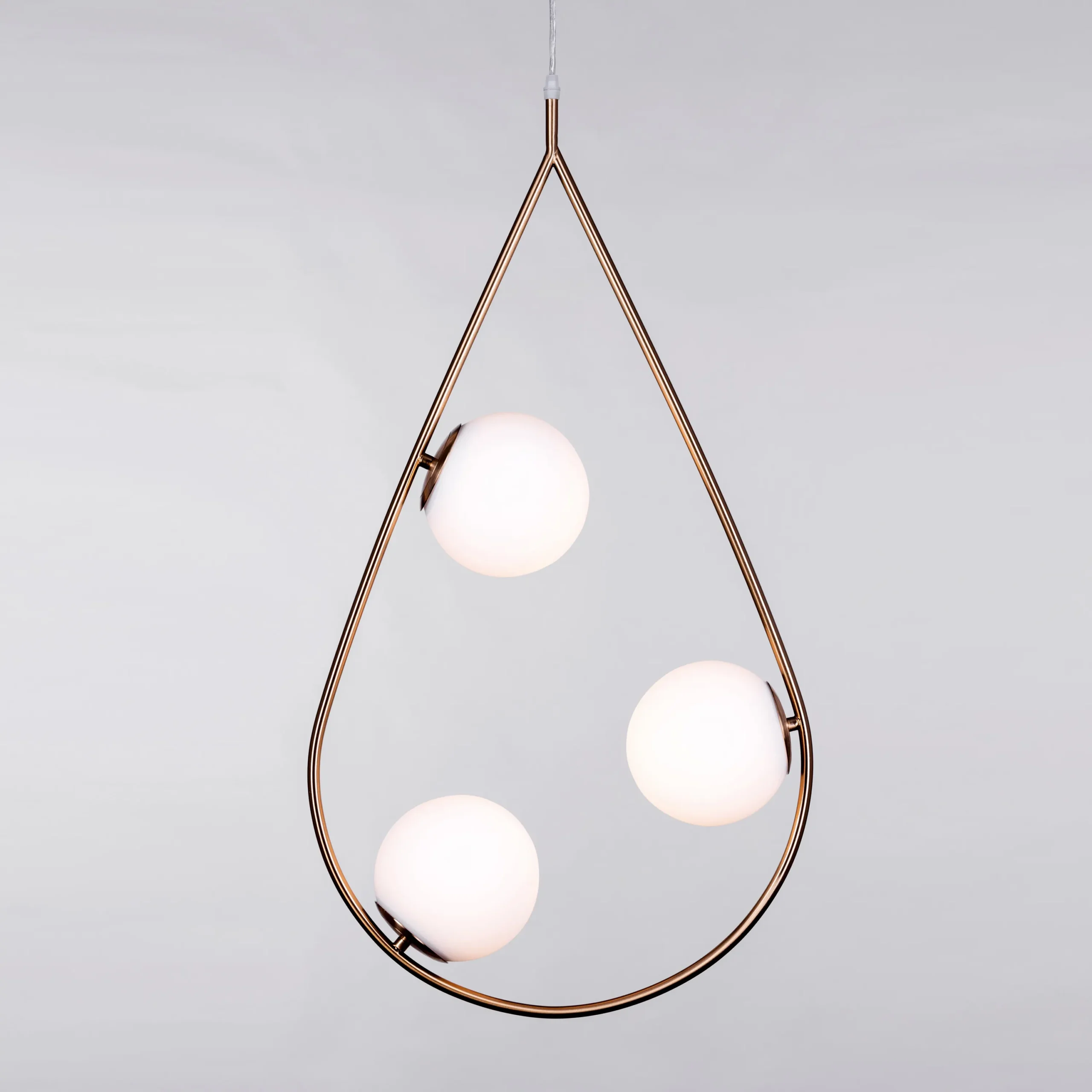 Transform your living space with this striking modern pendant light fixture that commands attention through its unique teardrop-shaped design. The elegant brass finish adds a touch of sophistication, while three suspended glass spheres create a captivating visual display. Each frosted globe diffuses light beautifully, casting a warm, ambient glow perfect for contemporary interiors. The asymmetrical arrangement of the spheres within the teardrop frame creates an artistic statement piece that works wonderfully above dining tables, in living rooms, or as entryway lighting. The minimalist design harmoniously blends form and function, making it an ideal choice for modern and transitional décor styles. The pendant’s clean lines and balanced proportions ensure it complements rather than overwhelms your space. Whether illuminated or not, this fixture serves as a stunning sculptural element that elevates any room’s aesthetic appeal.